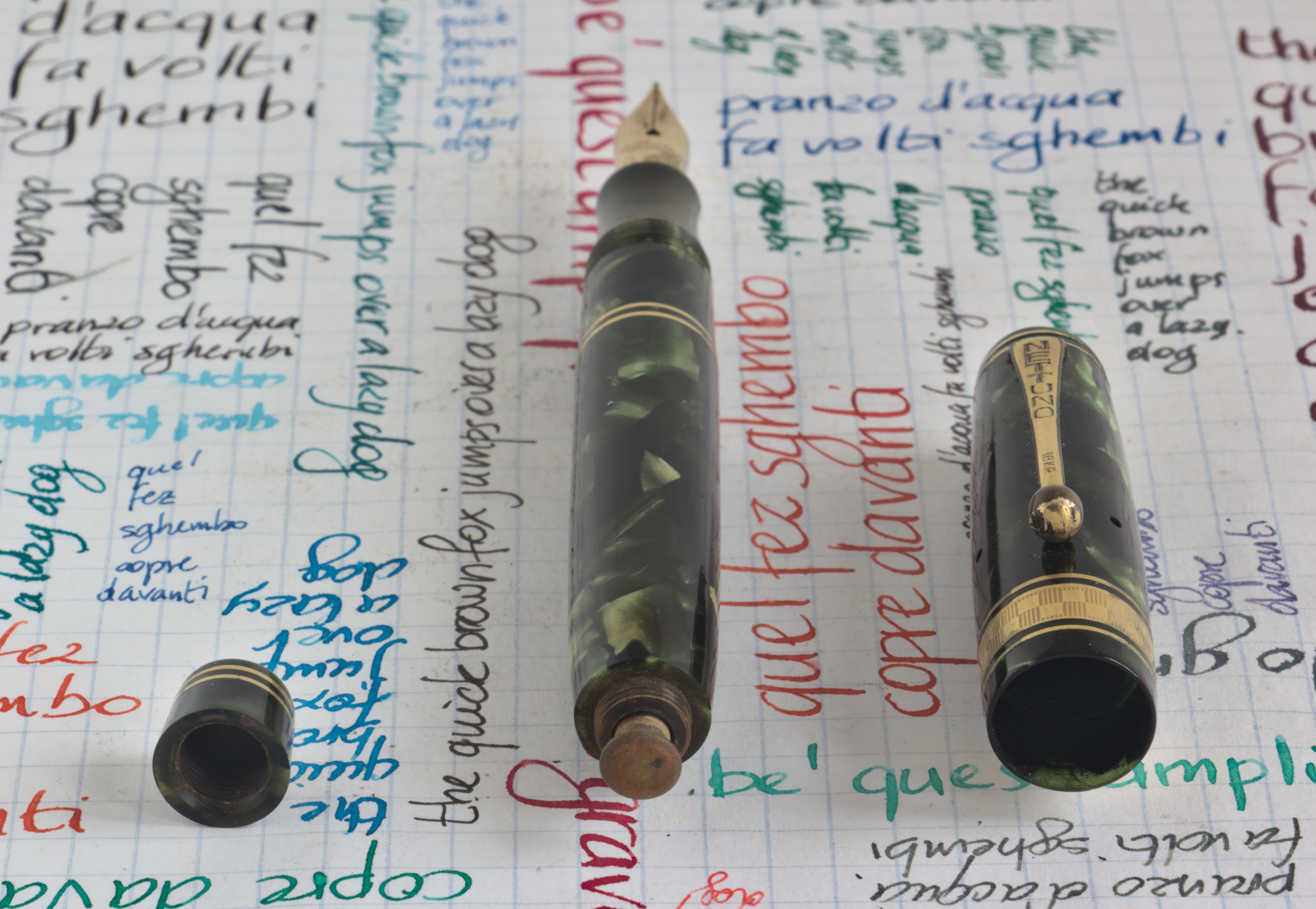 Foto di una penna Nettuno. Modello: Nettuno Superba. Caricamento a pulsante di fondo. Realizzazione in celluloide marmorizzata verde. Versione grande.
