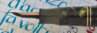 Photo of a pen produced by Nettuno. Model: Nettuno Superba. Filling system: button filler. In green marbled celluloid. Detail of nib. Detail of feeder. Big size version.