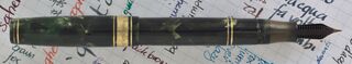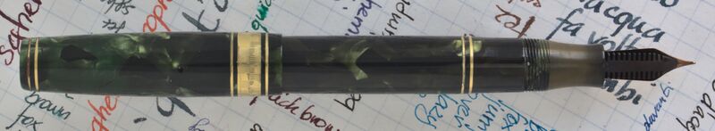 Foto di una penna Nettuno. Modello: Nettuno Superba. Caricamento a pulsante di fondo. Realizzazione in celluloide marmorizzata verde. Versione grande.