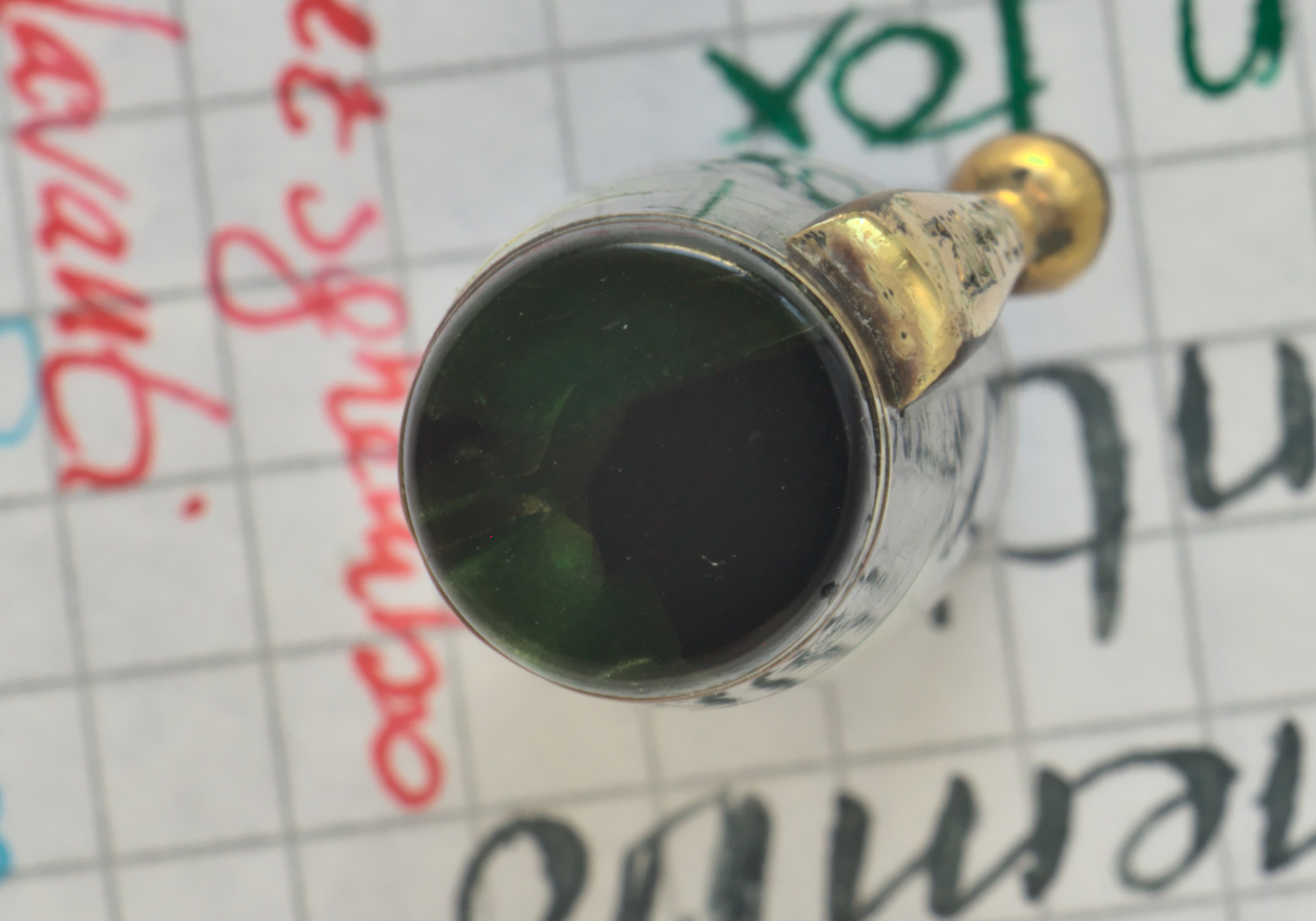 Photo of a pen produced by Nettuno. Model: Nettuno Superba. Filling system: button filler. In green marbled celluloid. Detail of cap head. Big size version.