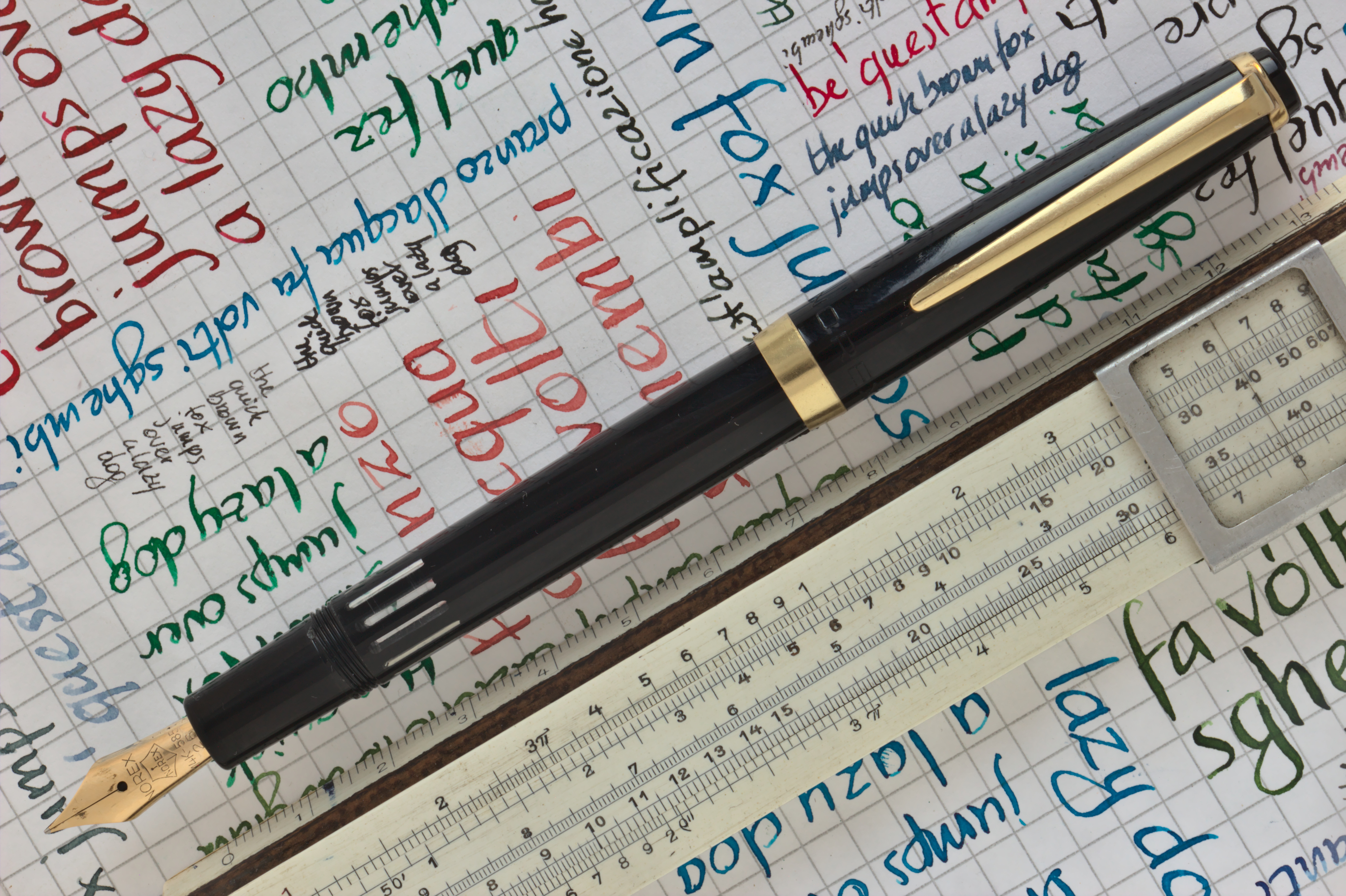 Foto di una penna Norex. Modello: Norex 570. Caricamento a stantuffo. Realizzazione in resina plastica nera. Penna di qualità con con pennino in oro 14k.