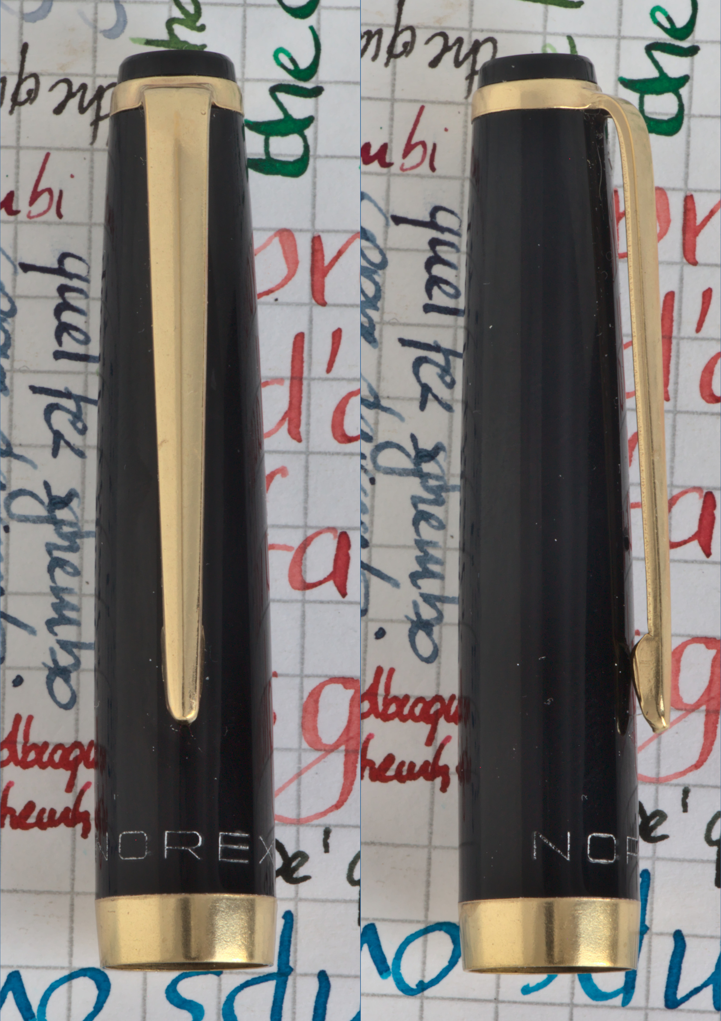 Photo of a pen produced by Norex. Model: Norex 570. Filling system: piston filler. In black plastic resin. Detail of cap. Quality pen with 14k gold nib.