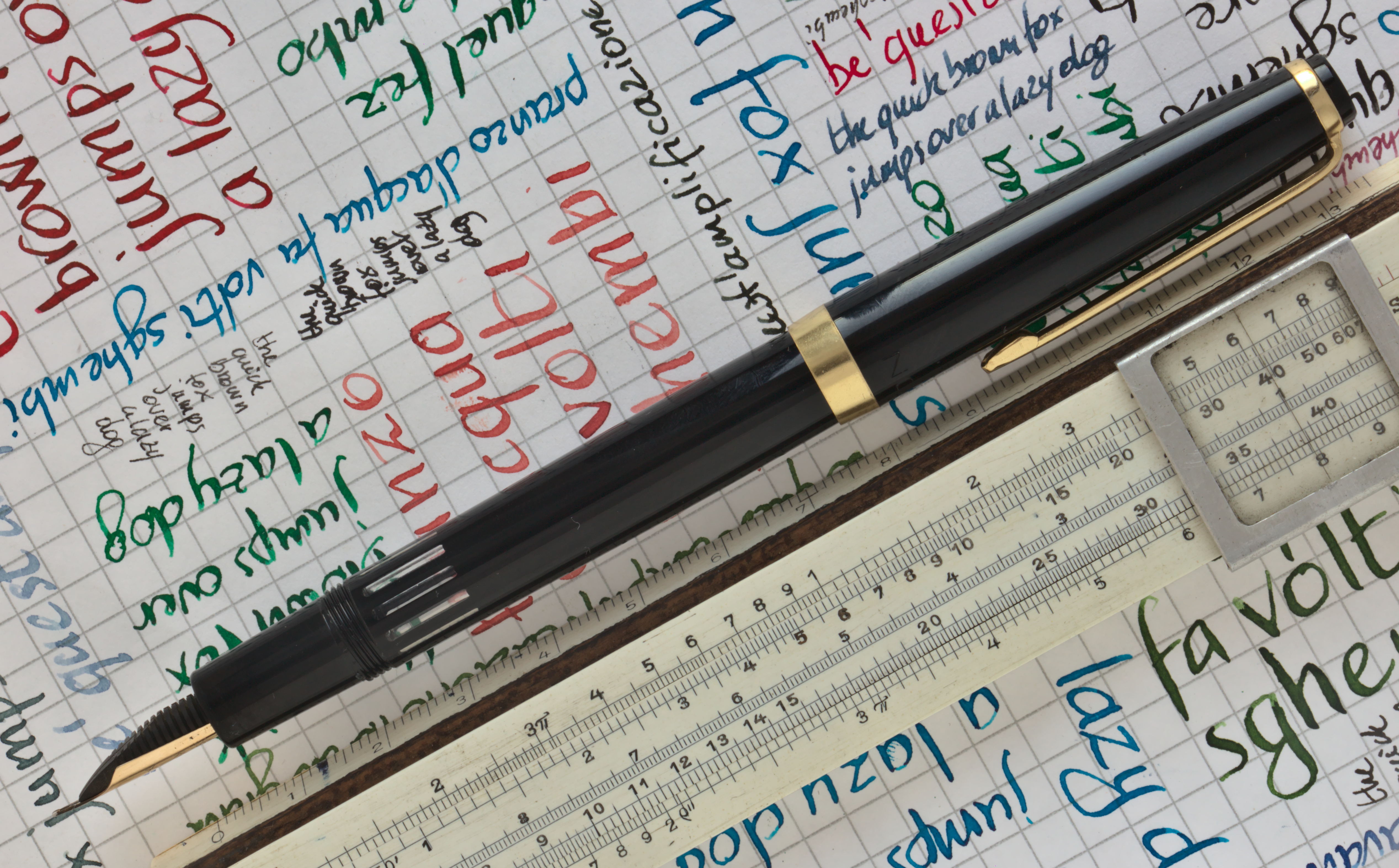 Foto di una penna Norex. Modello: Norex 570. Caricamento a stantuffo. Realizzazione in resina plastica nera. Penna di qualità con con pennino in oro 14k.