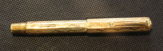 Photo of a pen produced by Omas. Filling system: lever filler. With geometric pattern faceted gold rolled overlay. Unusual overlay model. Photographed at 2016 Brescia Pen Show.