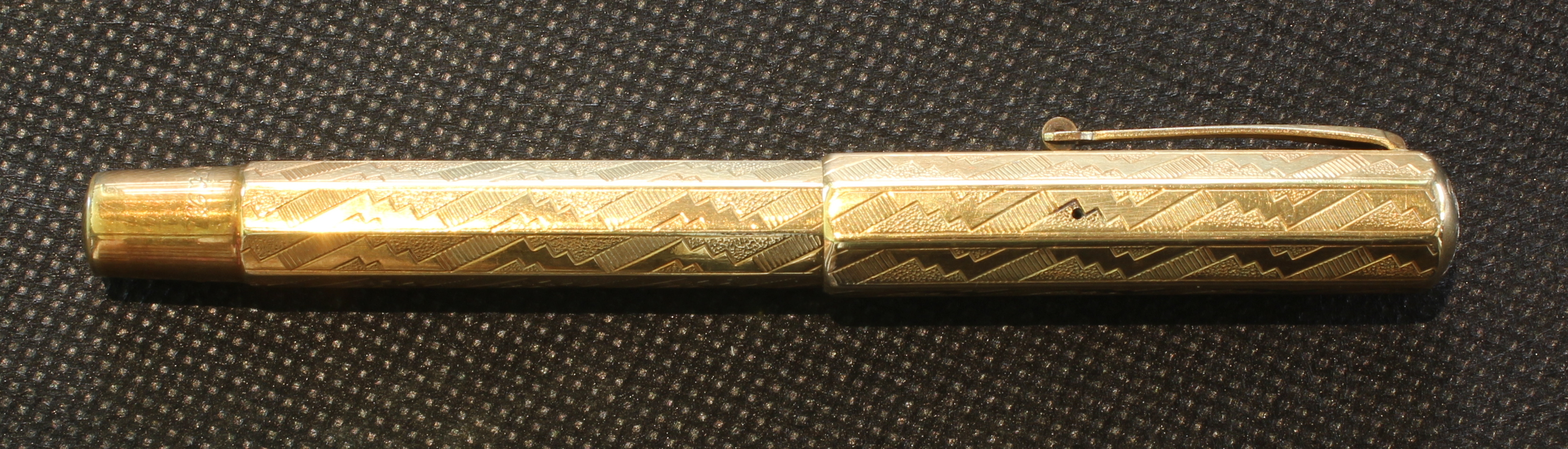 Photo of a pen produced by Omas. Filling system: lever filler. With geometric pattern faceted gold rolled overlay. Unusual overlay model. Photographed at 2016 Brescia Pen Show.