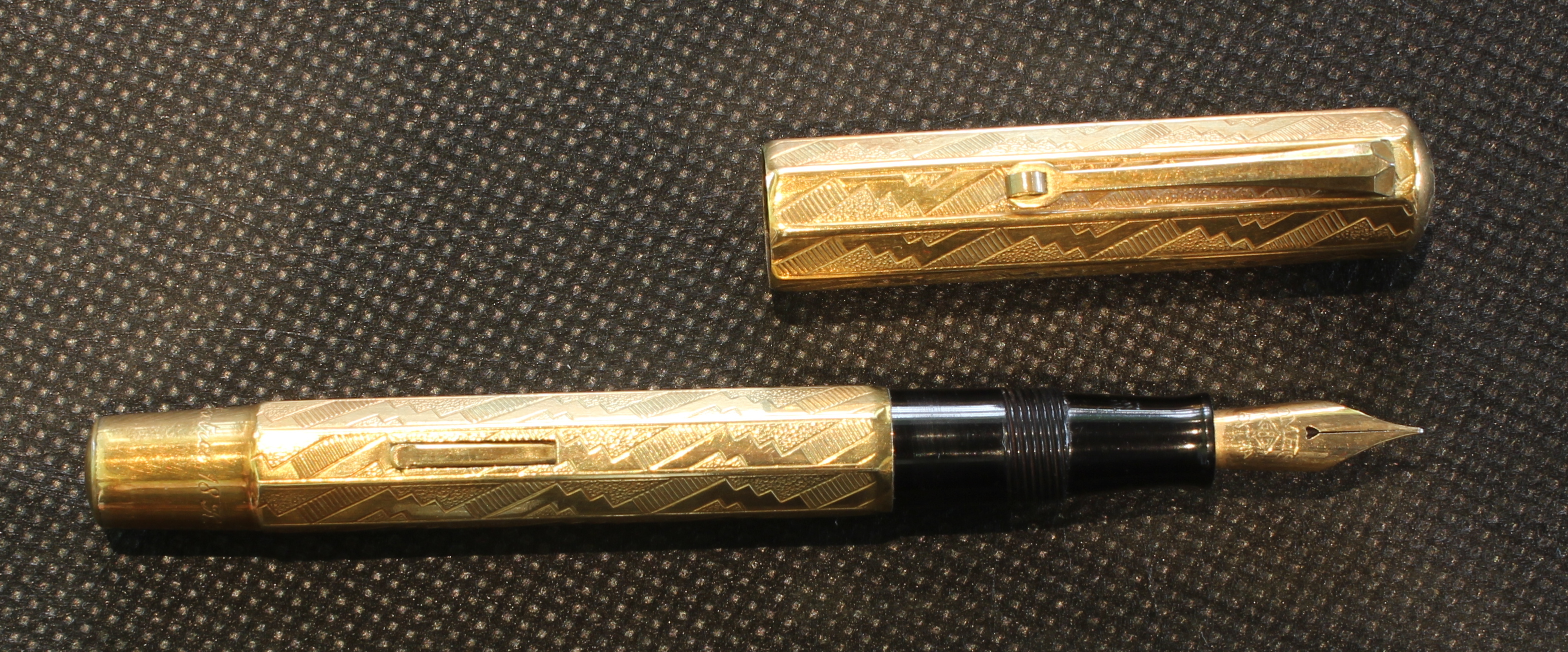 Photo of a pen produced by Omas. Filling system: lever filler. With geometric pattern faceted gold rolled overlay. Unusual overlay model. Photographed at 2016 Brescia Pen Show.