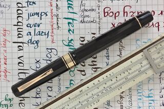 Foto di una penna Omas. Modello: Omas Gentlemen. Caricamento a stantuffo. Realizzazione in celluloide nera. Ultimo modello in celluloide prodotto dalla Omas.