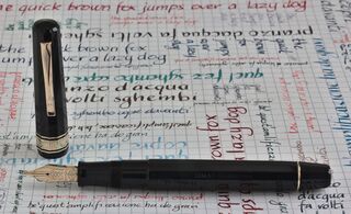 Foto di una penna Omas. Modello: Omas Gentlemen. Caricamento a stantuffo. Realizzazione in celluloide nera. Ultimo modello in celluloide prodotto dalla Omas.