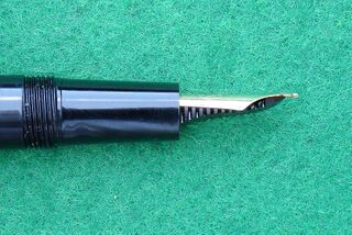 Foto di una penna Omas. Modello: Omas Studio. Caricamento a stantuffo. Realizzazione in resina plastica nera. Dettaglio del pennino. Dettaglio dell'alimentatore. Riporta stampigliato il brevetto nº IT-653209.