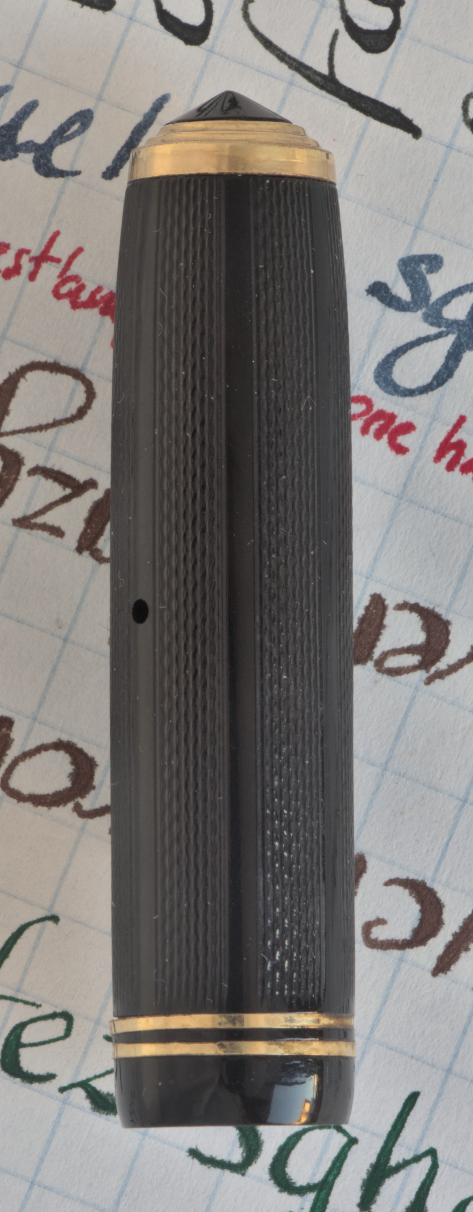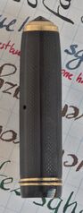 Photo of a pen produced by Osmia. Model: Osmia 64G. Filling system: piston filler. In black chased celluloid. Detail of cap. Pen with #4 nib.