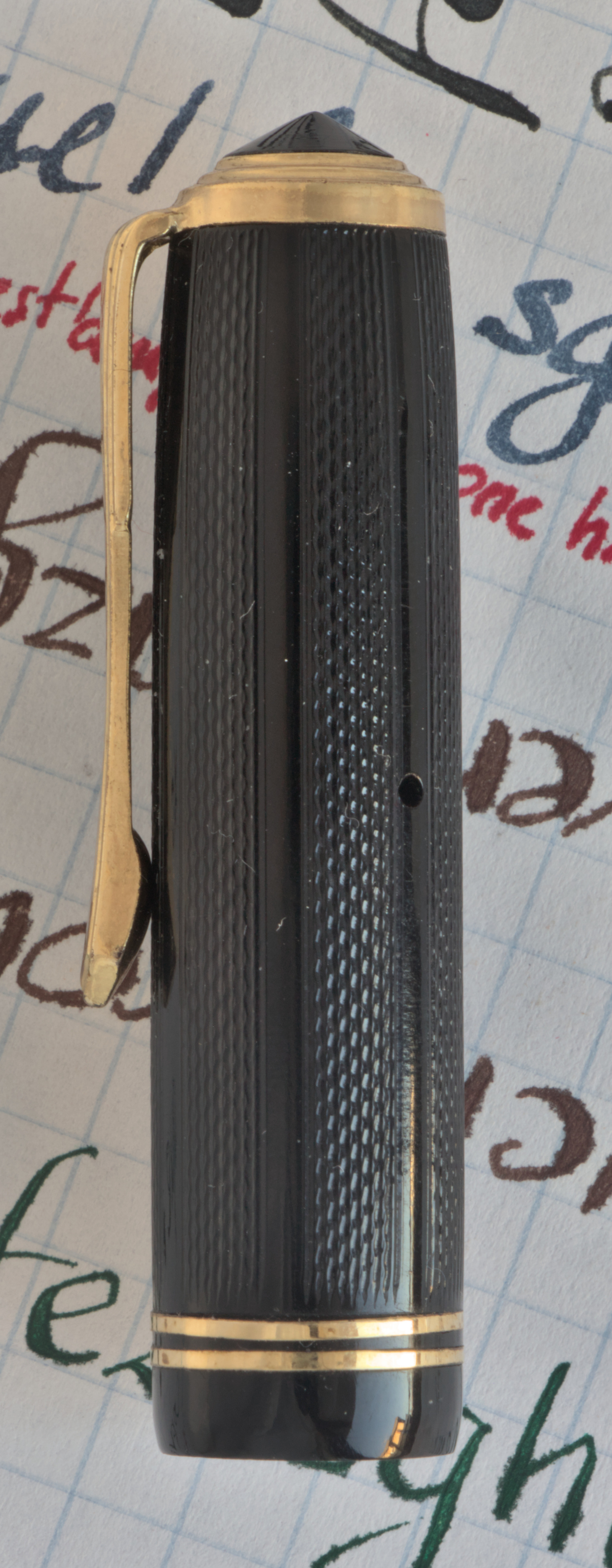 Photo of a pen produced by Osmia. Model: Osmia 64G. Filling system: piston filler. In black chased celluloid. Detail of cap. Pen with #4 nib.