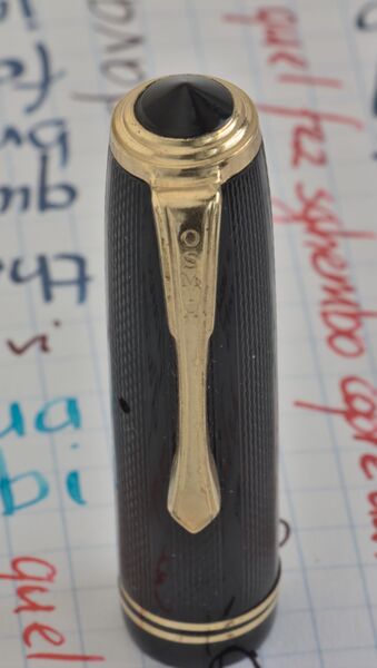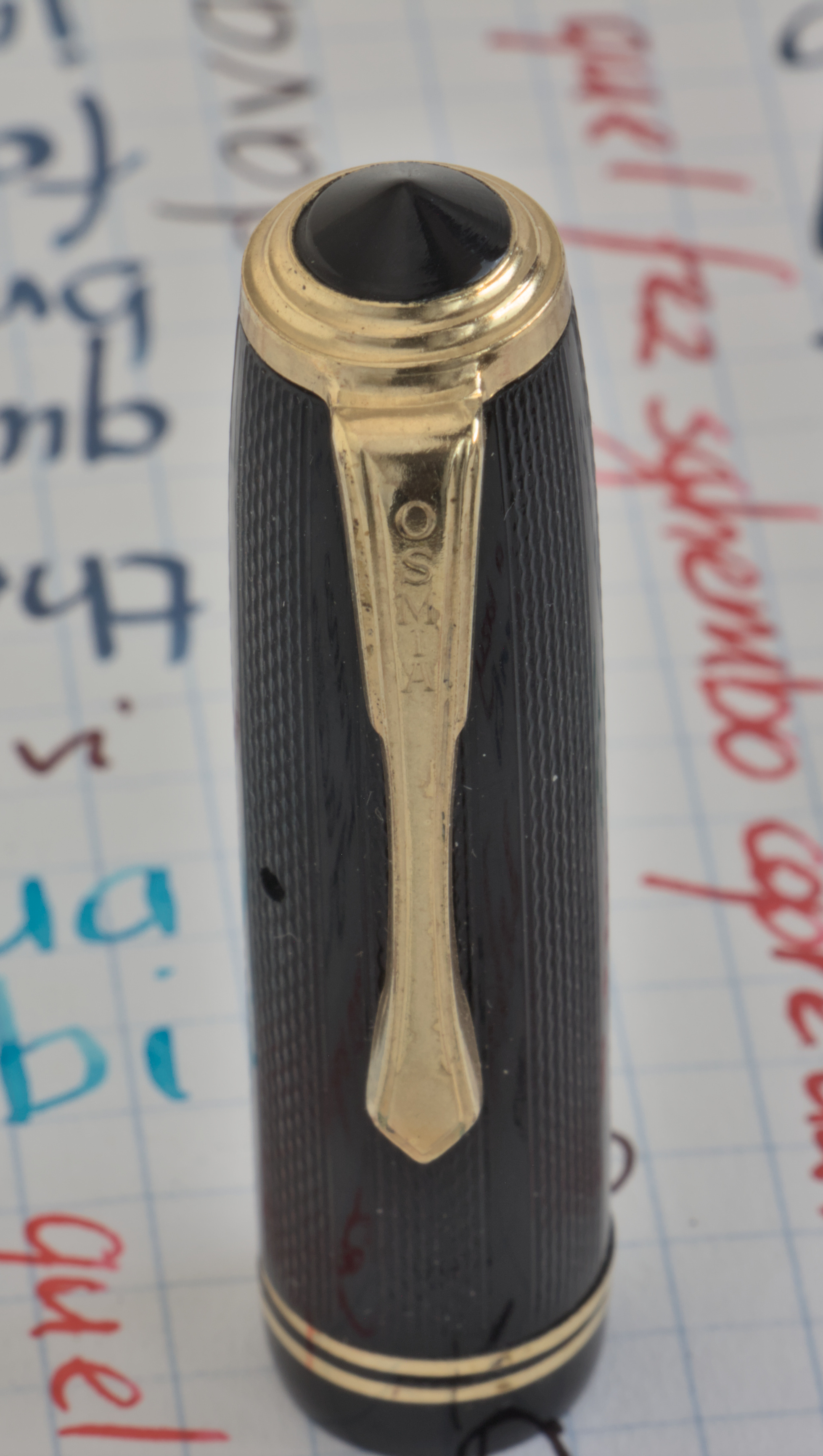 Photo of a pen produced by Osmia. Model: Osmia 64G. Filling system: piston filler. In black chased celluloid. Detail of clip. Pen with #4 nib.