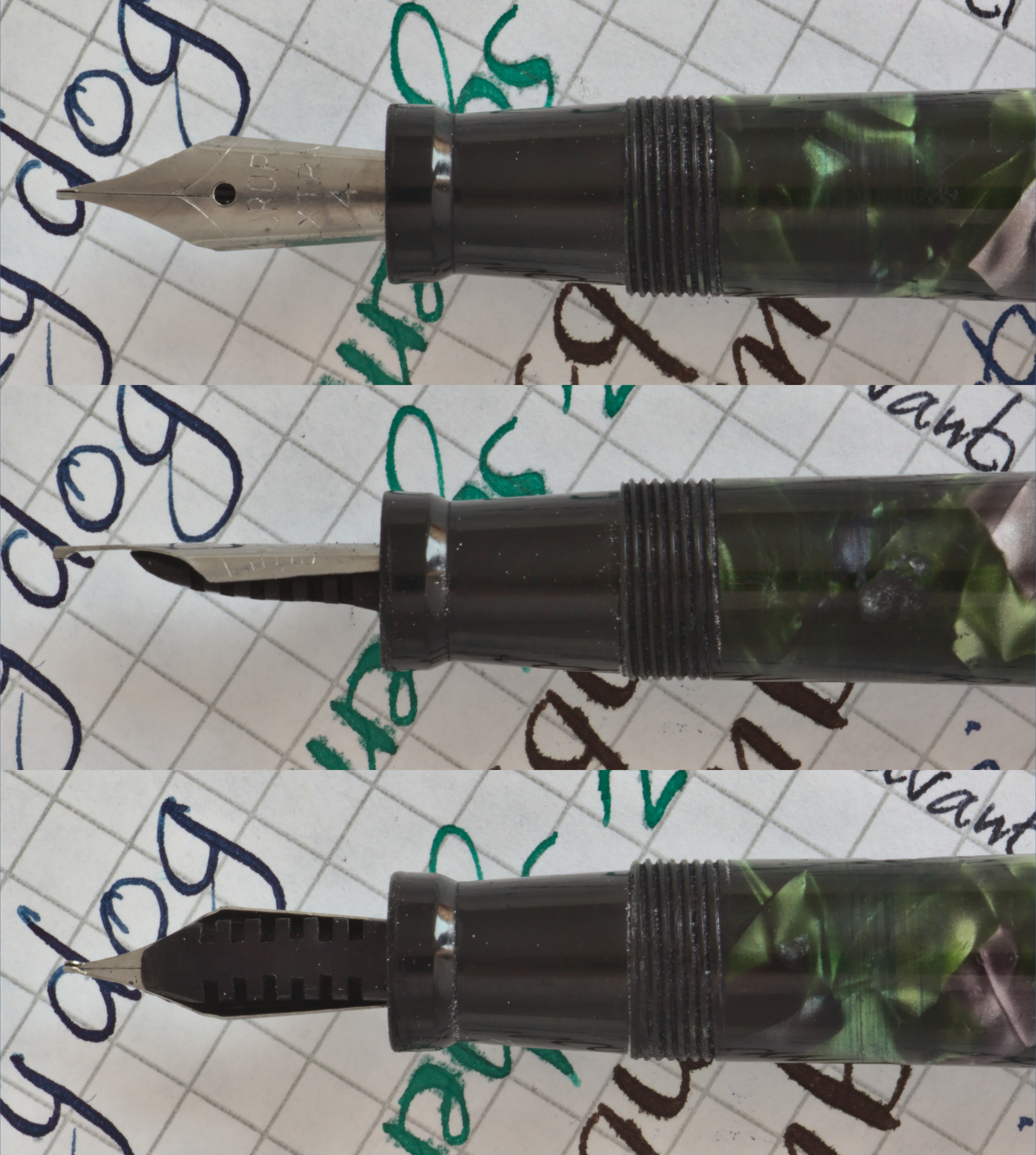 Foto di una penna Palladiana (un marchio della Fratelli Rossi Vicenza). Caricamento a pulsante di fondo. Realizzazione in celluloide marmorizzata verde e grigia. Dettaglio del pennino. Dettaglio dell'alimentatore. Modello ignoto, con clip svasata e curva a punta triangolare, e testina tronco conica.
