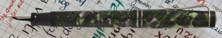 Foto di una penna Palladiana (un marchio della Fratelli Rossi Vicenza). Caricamento a pulsante di fondo. Realizzazione in celluloide marmorizzata verde e grigia. Modello ignoto, con clip svasata e curva a punta triangolare, e testina tronco conica.