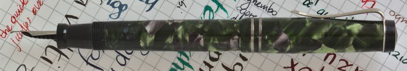 Photo of a pen produced by Palladiana (a Fratelli Rossi Vicenza trademark). Filling system: button filler. In green and gray marbled celluloid. Unknown model, with flared and curved clip with triangular tip, and truncated conical head