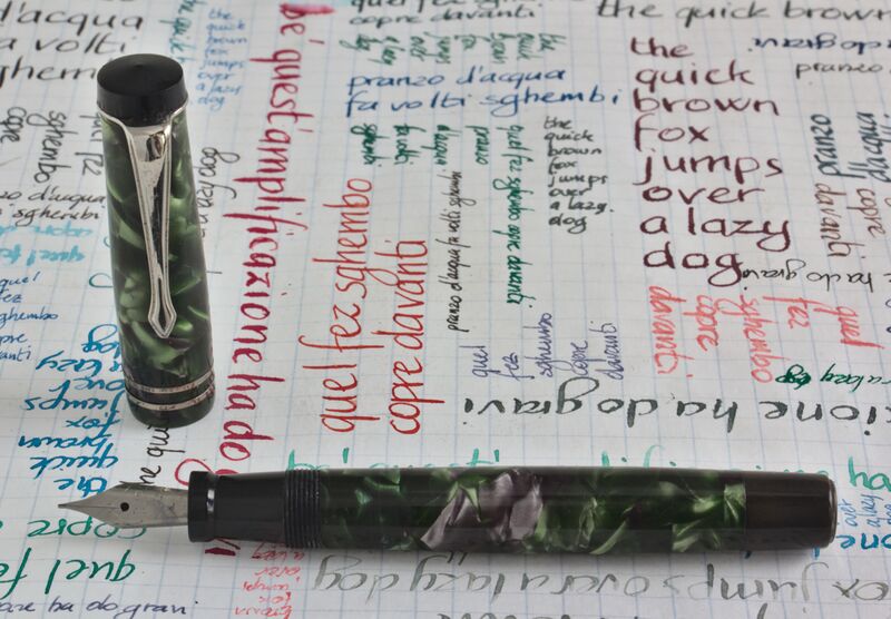 Foto di una penna Palladiana (un marchio della Fratelli Rossi Vicenza). Caricamento a pulsante di fondo. Realizzazione in celluloide marmorizzata verde e grigia. Modello ignoto, con clip svasata e curva a punta triangolare, e testina tronco conica.