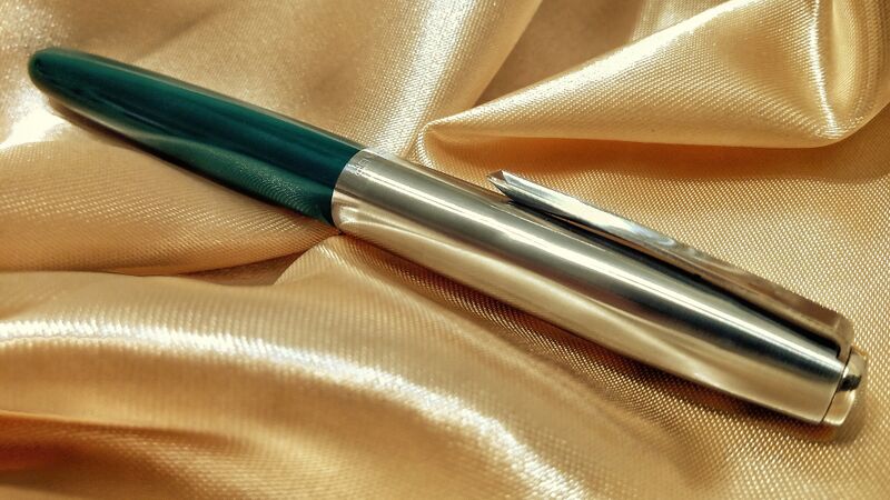 Photo of a pen produced by Parker. Model: Parker 21. Filling system: Aerometric. In green plastic resin. Mark I version.