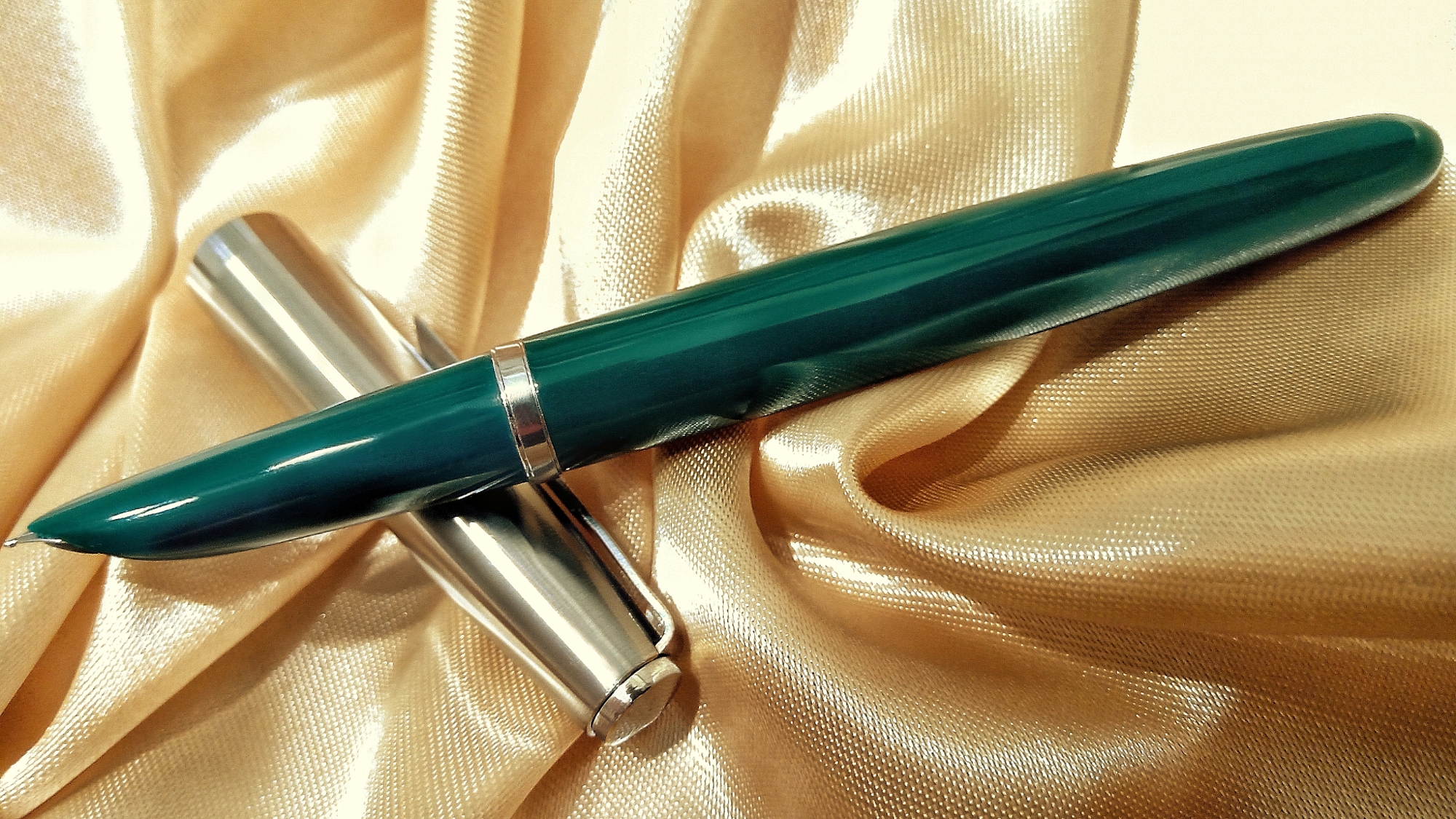 Photo of a pen produced by Parker. Model: Parker 21. Filling system: Aerometric. In green plastic resin. Mark I version.