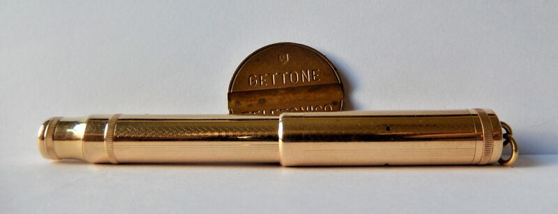 Photo of a pen produced by Parker. Model: Lucky Curve Pen N. 42. Filling system: button filler. With barleycorn band gold rolled overlay. Nib marked "Parker Lucky Curve Pen", also called The Midget.