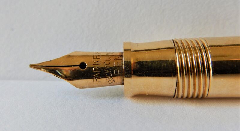 Photo of a pen produced by Parker. Model: Lucky Curve Pen N. 42. Filling system: button filler. With barleycorn band gold rolled overlay. Detail of nib. Nib marked "Parker Lucky Curve Pen", also called The Midget.