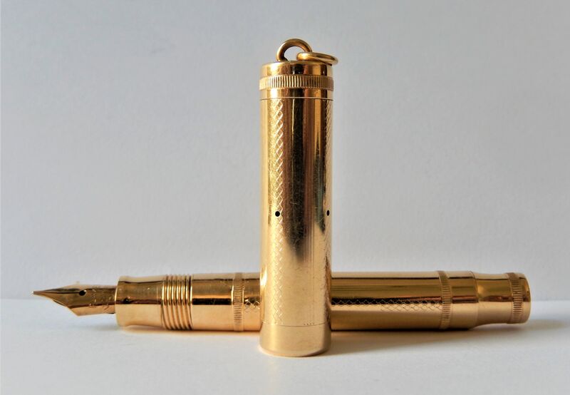 Photo of a pen produced by Parker. Model: Lucky Curve Pen N. 42. Filling system: button filler. With barleycorn band gold rolled overlay. Nib marked "Parker Lucky Curve Pen", also called The Midget.