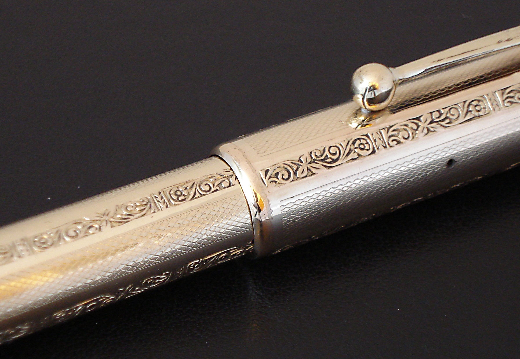 Photo of a pen produced by Parker. Model: Parker Lucky Curve. Filling system: button filler. With chased vertical band gold rolled overlay. Nib marked "Parker Lucky Curve Pen", number 2.