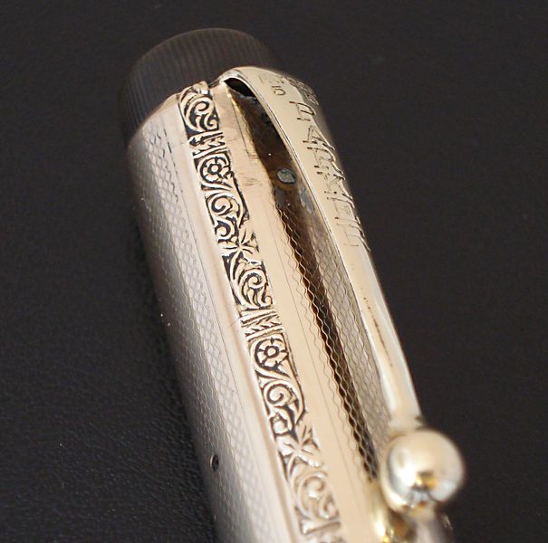 Photo of a pen produced by Parker. Model: Parker Lucky Curve. Filling system: button filler. With chased vertical band gold rolled overlay. Detail of clip. Nib marked "Parker Lucky Curve Pen", number 2.