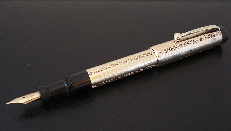 Photo of a pen produced by Parker. Model: Parker Lucky Curve. Filling system: button filler. With chased vertical band gold rolled overlay. Nib marked "Parker Lucky Curve Pen", number 2.