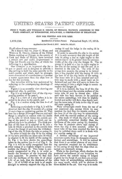 | attuale | 01:34, 24 lug 2012 | 1 159 × 1 704, 3 pagine (161 KB) | Piccardi (discussione | contributi) | {{PatentInfo |Inventor=John C. Wahl, William H. Odlum |Assignee=The Wahl Company |Country=US |ApplicationNum=153417 |ApplicationDate=1917-03-08 |PatentNum=1279186 |PatentDate=1918-09-17 |PriorityDate=1917-03-08 |Titolo=Clip for pencil and the like |Mar... |