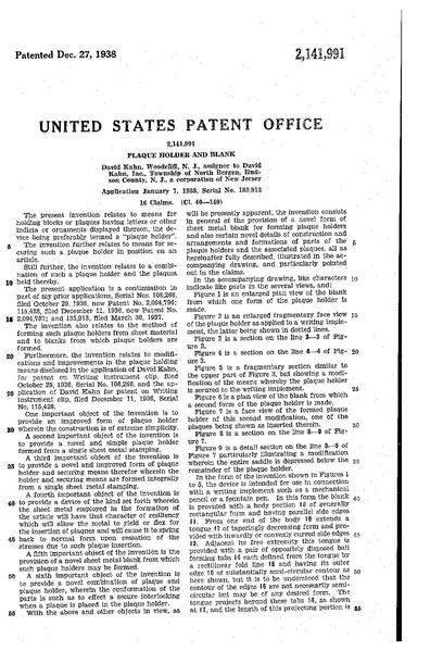 | attuale | 23:16, 8 ago 2013 | 1 159 × 1 704, 5 pagine (304 KB) | Piccardi (discussione | contributi) | {{PatentInfo |Inventor=David Kahn |Assignee=David Kahn Inc |Country=US |ApplicationNum=183913 |ApplicationDate=1938-01-07 |PatentNum=2141991 |PatentDate=1938-12-27 |PriorityDate=1938-01-07 |Titolo=Plaque holder and blank |Marca=Wearever |Descrizione=Fe... |