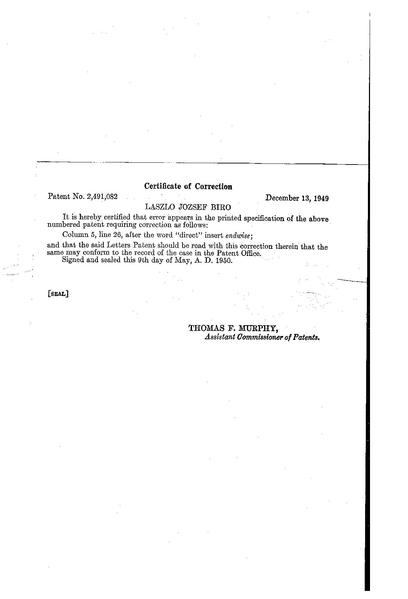 Brevetto per una penna a sfera, ceduto alla Eversharp. Priorità da brevetto argentino. Riferimenti a n° US-2400679; nº US-1701263 e nº US-2258841 ed inoltre nº FR-628418.