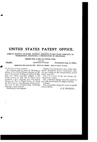 | attuale | 21:34, 18 ago 2012 | 1 159 × 1 704, 2 pagine (43 KB) | Piccardi (discussione | contributi) | {{PatentInfo |Inventor=John H. Worthy |Assignee=The Wahl Company |Country=US |ApplicationNum=464452 |ApplicationDate=1921-05-25 |PatentNum=D058694 |PatentDate=1921-08-09 |PriorityDate=1921-05-25 |Titolo=Design for a pen or pencil case |Marca=Eversharp ... |