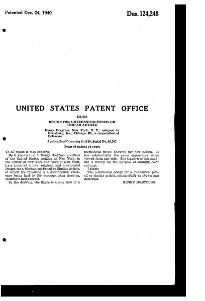 | attuale | 22:53, 21 ago 2012 | 1 159 × 1 704, 2 pagine (34 KB) | Piccardi (discussione | contributi) | {{PatentInfo |Inventor=Henry Dreyfuss |Assignee=The Wahl Company |Country=US |ApplicationNum=96362 |ApplicationDate=1940-11-06 |PatentNum=D124248 |PatentDate=1940-12-24 |PriorityDate=1940-11-06 |Titolo=Design for a pencil or similar article |Marca=Ever... |
