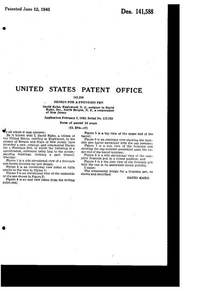 | attuale | 23:31, 29 ago 2012 | 1 159 × 1 704, 3 pagine (54 KB) | Piccardi (discussione | contributi) | {{PatentInfo |Inventor=David Kahn |Assignee=David Kahn Inc. |Country=US |ApplicationNum=117720 |ApplicationDate=1945-02-02 |PatentNum=D141588 |PatentDate=1945-06-12 |PriorityDate=1945-02-02 |Titolo=Design for a fountain pen |Marca=Wearever |Descrizione... |