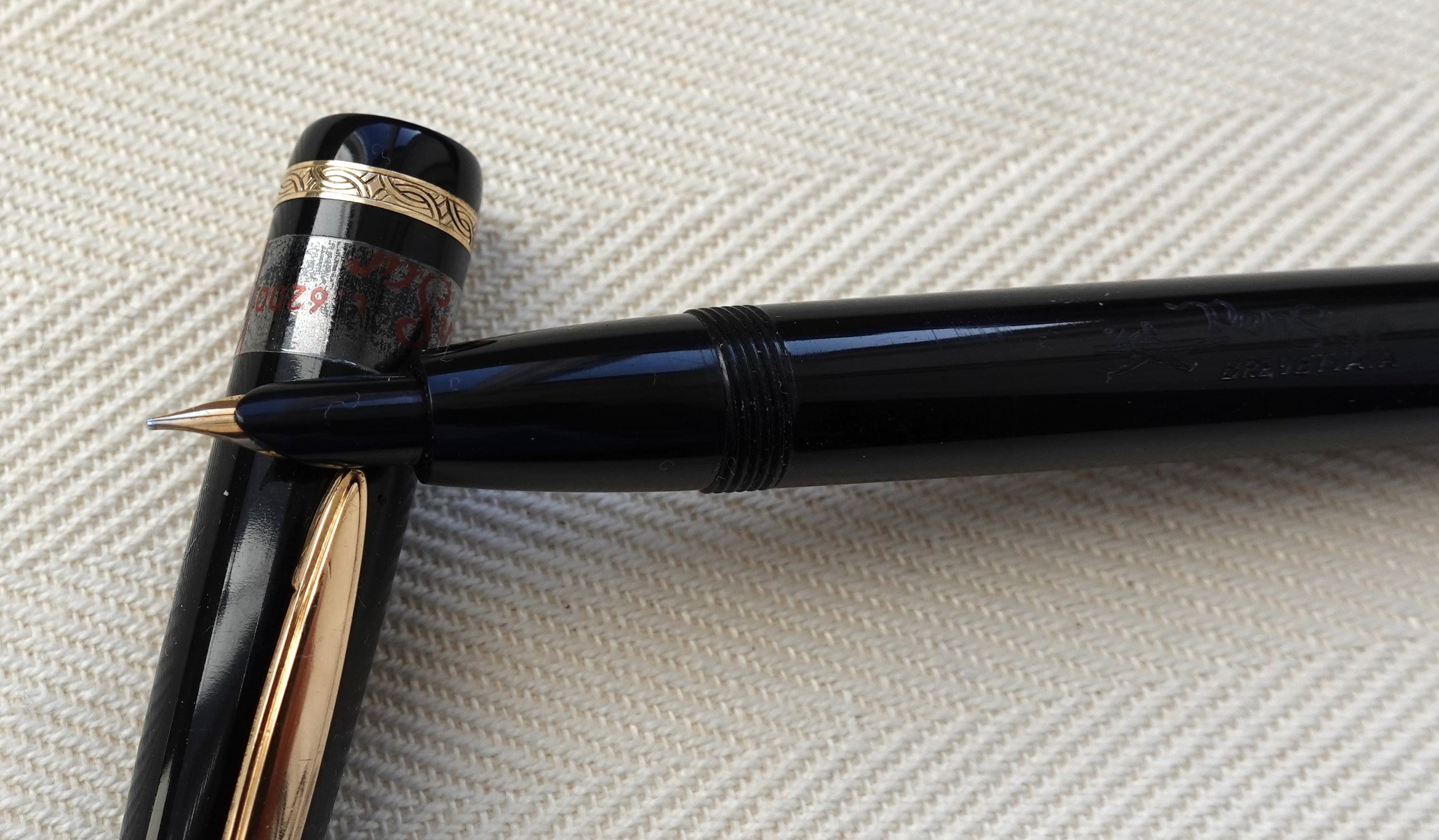 Foto di una penna Pen-Sar. Realizzazione in resina plastica nera. Modello ignoto, con veretta singola cesellata, dotata di un peculiare caricamento a pompa con la pressione del pennino sul fondo della boccetta di inchiostro. Contributo di Andrea (utente forum bisguillo).