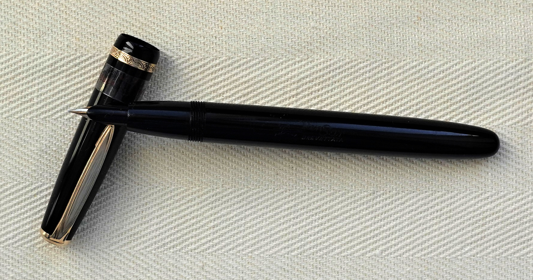 Photo of a pen produced by Pen-Sar. In black plastic resin. Unknown model, with single engraved ring, equipped with a unique pump filling system with nib pressure at the bottom of the ink bottle.