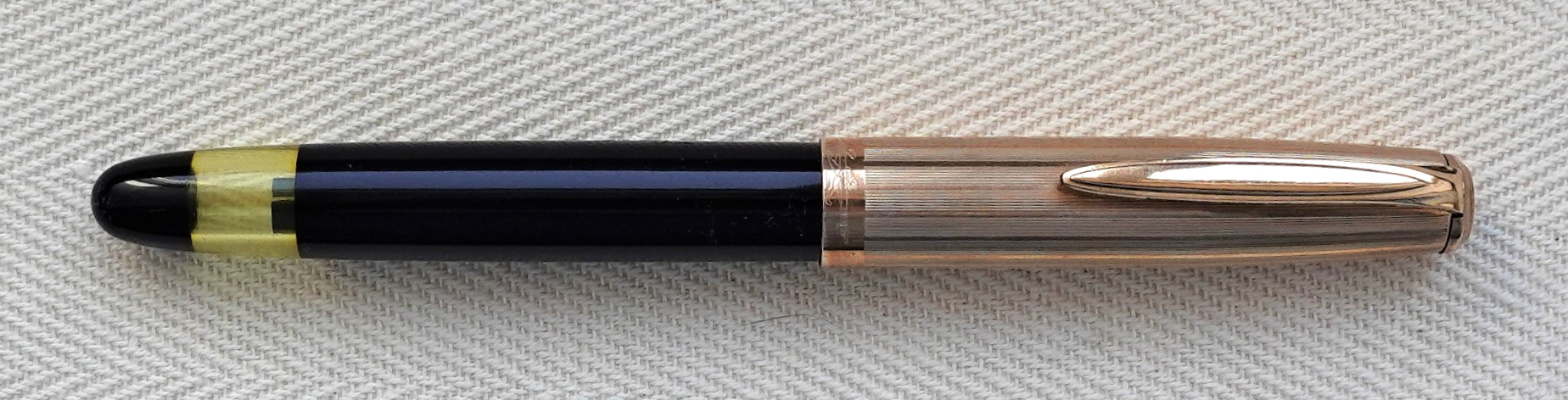 Foto di una penna Pen-Sar. Realizzazione in resina plastica nera. Modello ignoto, con cappuccio laminato in oro e finestra di visualizzazione sul fondo, dotata di un peculiare caricamento a pompa con la pressione del pennino sul fondo della boccetta di inchiostro. Contributo di Andrea (utente forum bisguillo).