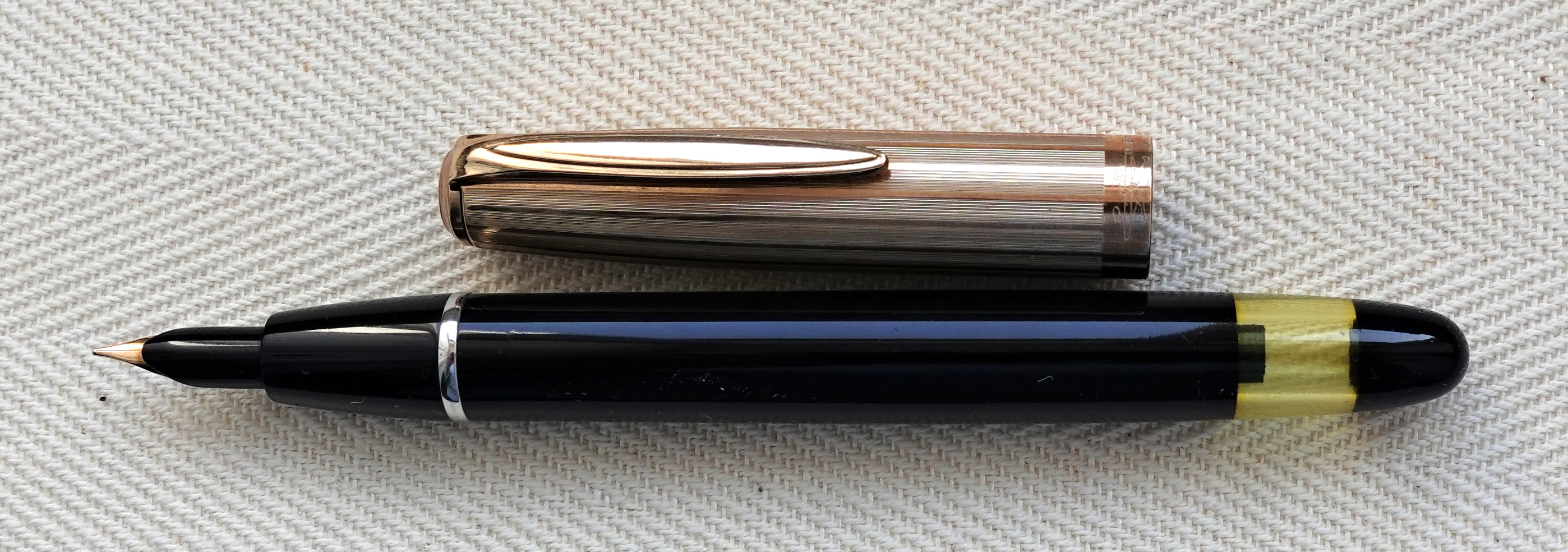 Foto di una penna Pen-Sar. Realizzazione in resina plastica nera. Modello ignoto, con cappuccio laminato in oro e finestra di visualizzazione sul fondo, dotata di un peculiare caricamento a pompa con la pressione del pennino sul fondo della boccetta di inchiostro. Contributo di Andrea (utente forum bisguillo).