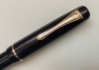 Photo of a pen produced by Pilot. Model: Pilot RT. Filling system: lever filler. In black celluloid. Detail of cap. With may 1940 gold nib.