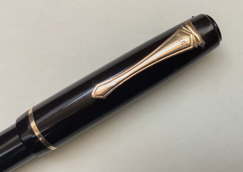 Foto di una penna Pilot. Modello: Pilot RT. Caricamento a levetta. Realizzazione in celluloid nera. Dettaglio del cappuccio. Con pennino in oro del maggio 1940. Contributo di Mirko, (utente forum Mir70).