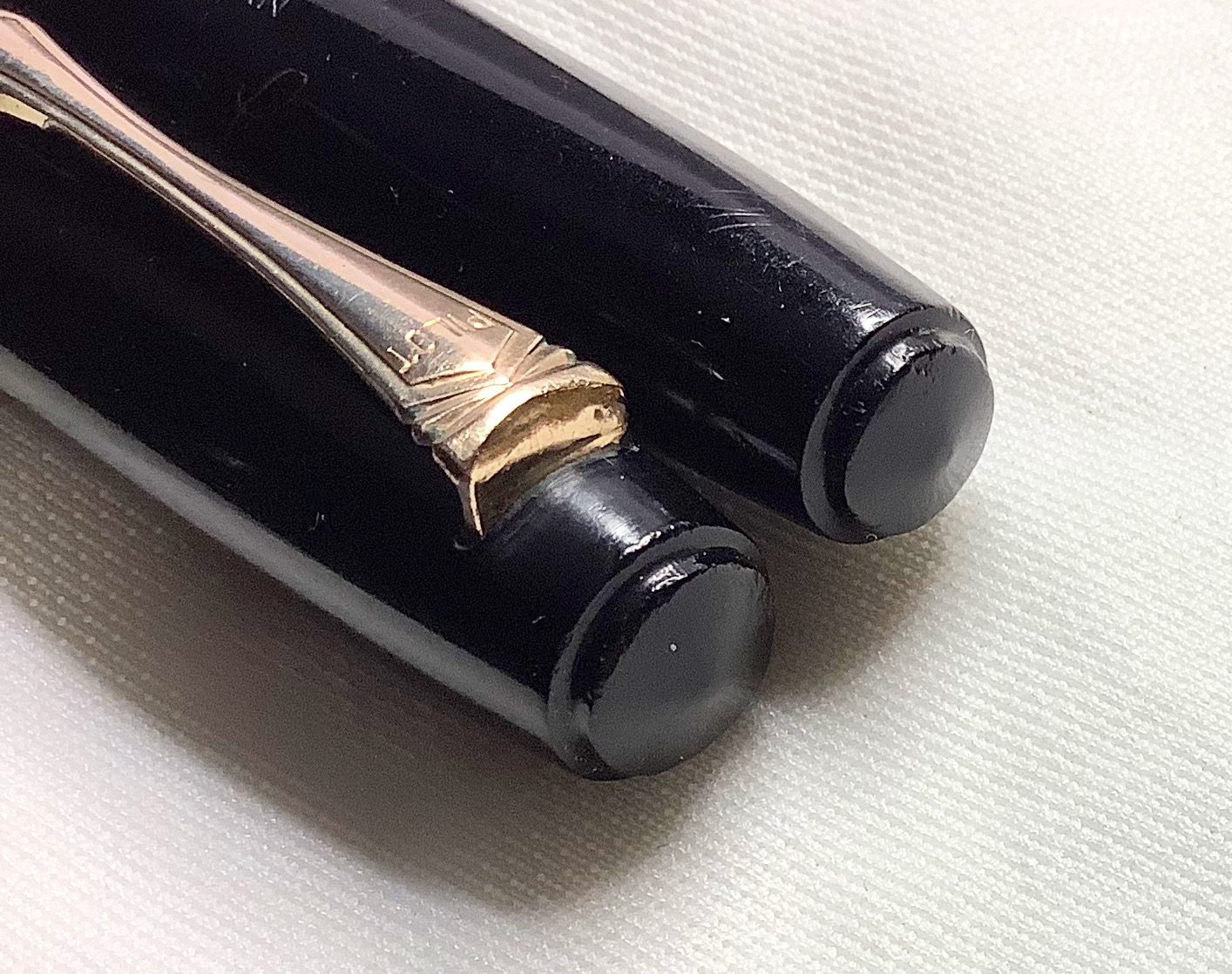 Foto di una penna Pilot. Modello: Pilot RT. Caricamento a levetta. Realizzazione in celluloid nera. Dettaglio della testa del cappuccio. Dettaglio del fondo. Con pennino in oro del maggio 1940. Contributo di Mirko, (utente forum Mir70).