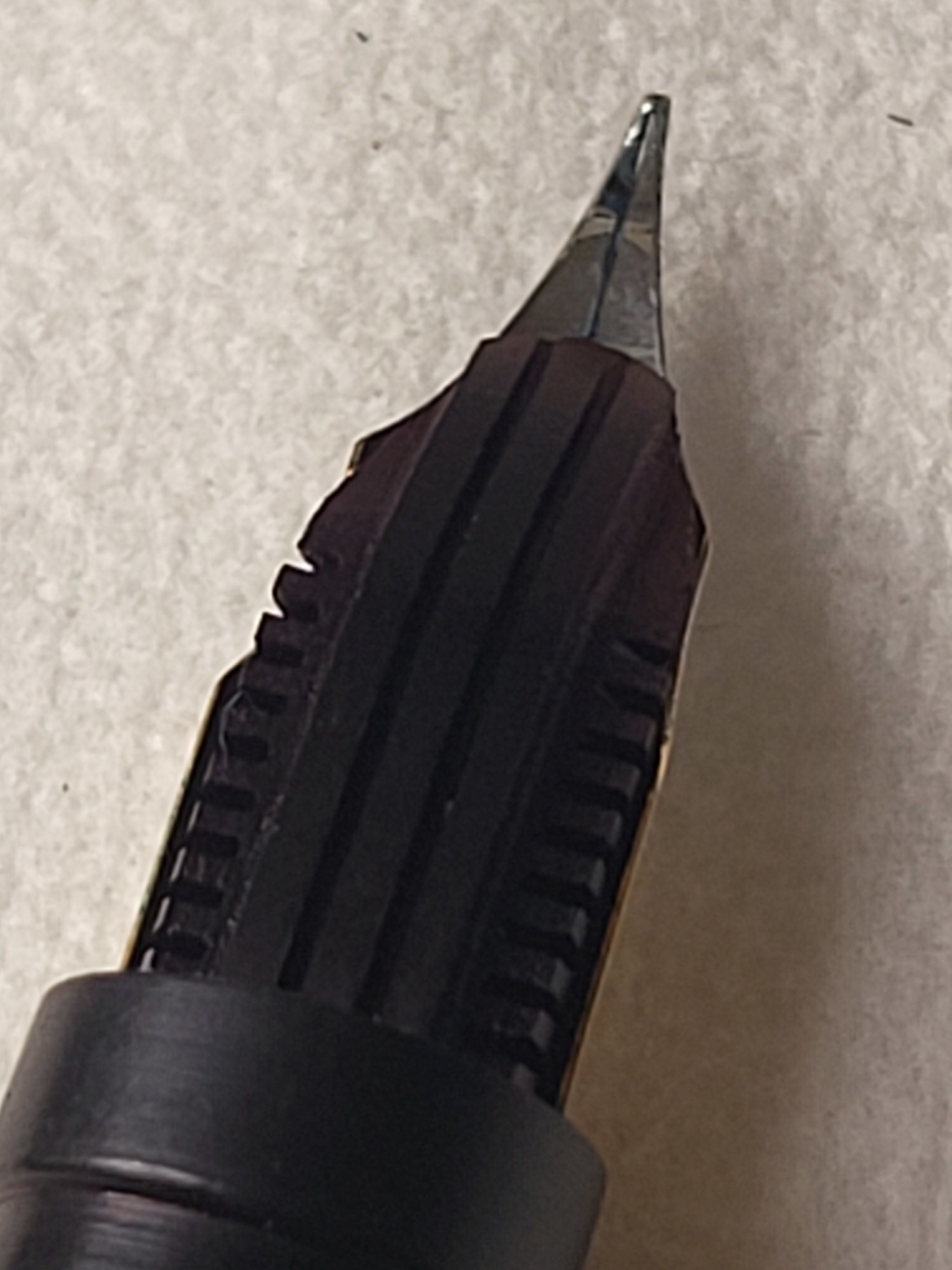 Foto di una penna Platinum. Caricamento a levetta. Realizzazione in resina plastica borgogna. Dettaglio dell'alimentatore. Modello chiara imitazione di una Skyline, marcato "PPP" sul fusto. Contributo di Modello60, (utente forum Modello60).