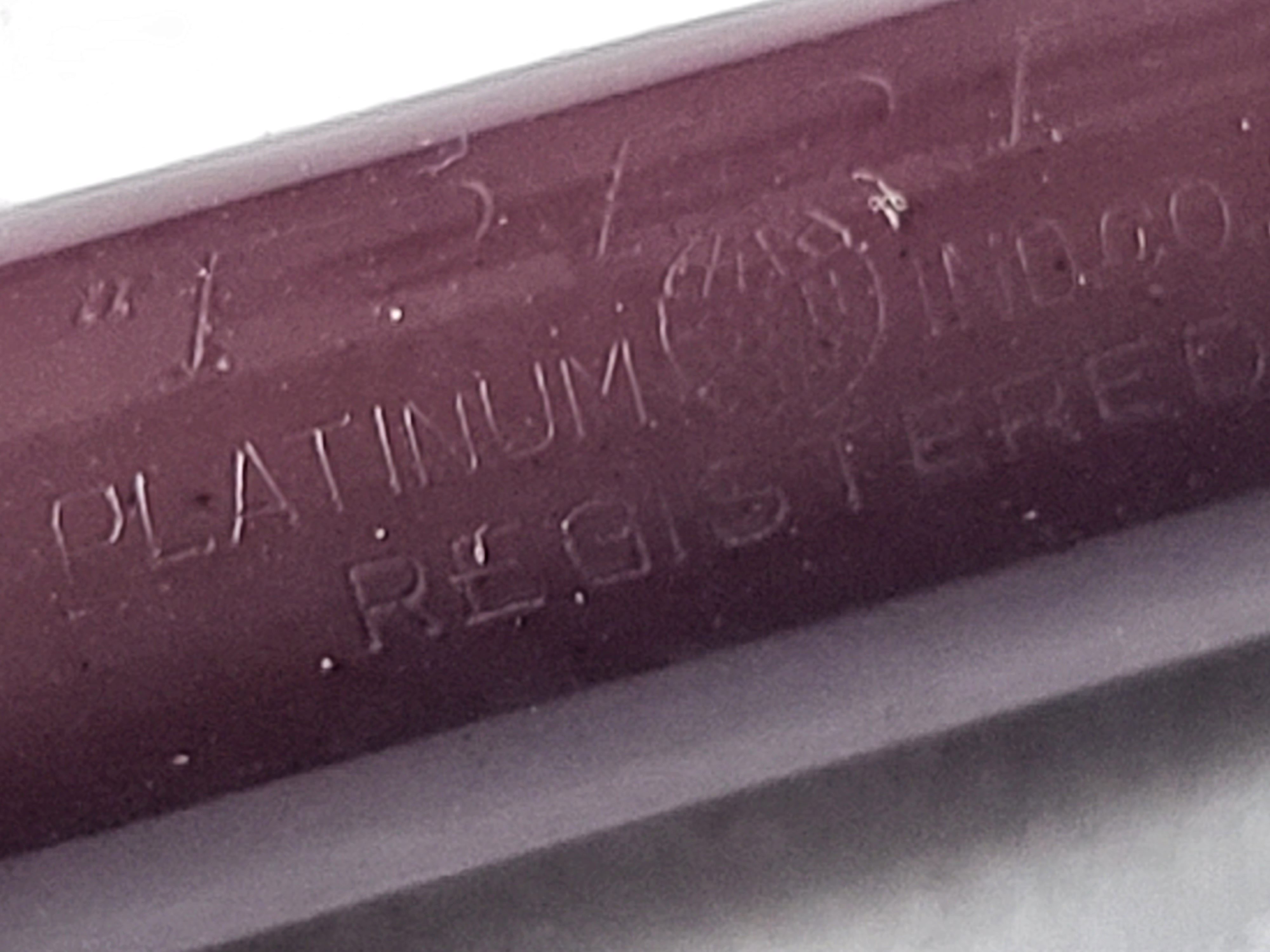 Foto di una penna Platinum. Caricamento a levetta. Realizzazione in resina plastica borgogna. Dettaglio della stampigliatura. Modello chiara imitazione di una Skyline, marcato "PPP" sul fusto. Contributo di Modello60, (utente forum Modello60).