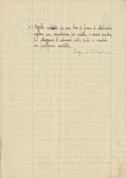 Privativa industriale per un modello ornamentale. Testo descrittivo della registrazione: "Oggetto costituito da una base di forma di ottaedro regolare con scanalatura per matita e incavo circolare per alloggiarvi il calamaio, sulla quale è montato un porta penna snodabile".