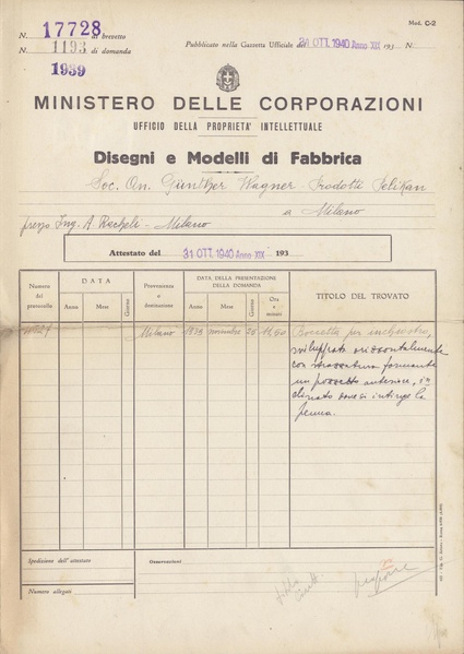 Privativa industriale per un modello di utilità della Pelikan. Testo descrittivo della registrazione: "Boccetta per inchiostro, sviluppata orizzontalmente con strozzatura formante un pozzetto anteriore, inclinato dove si intinge la penna".