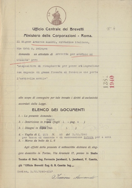 Privativa industriale per un modello di utilità della Omas. Testo descrittivo della registrazione: "Dispositivo di riempimento per penne stilografiche con capsula di gomma fissata al fondello che porta l'asticella mobile".