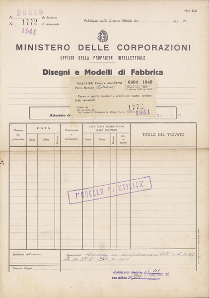 Privativa industriale per un modello di utilità. Testo descrittivo della registrazione: "Penne o matite tascabili e simili con nastro centimetrato estraibile".