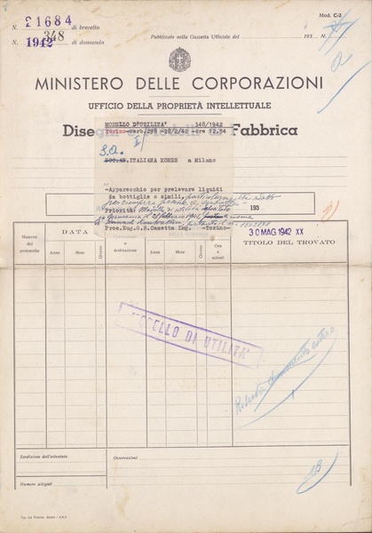 Privativa industriale per un modello di utilità della Kores. Testo descrittivo della registrazione: "Apparecchio per prelevare liquidi da bottiglie o simili, particolarmente adatto per riempire penne a serbatoio".