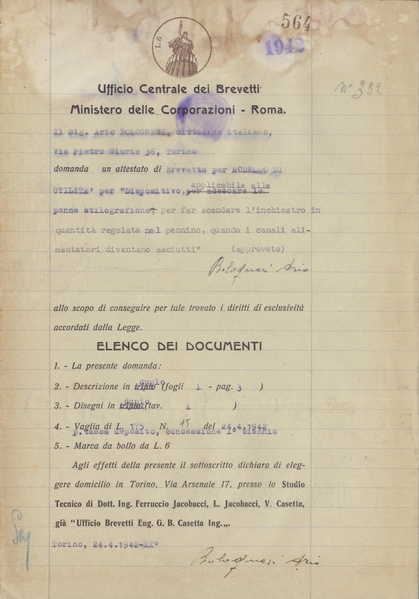 Privativa industriale per un modello di utilità. Testo descrittivo della registrazione: "Dispositivo applicabile alle penne stilografiche per far scendere l'inchiostro in quantità regolata nel pennino, quando i canali alimentatori diventano asciutti".
