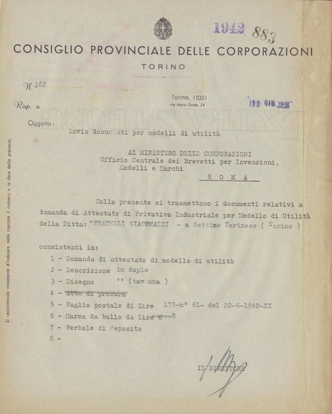 Privativa industriale per un modello di utilità della Giacomazzi. Testo descrittivo della registrazione: "Dispositivo di attacco del fermaglio elastico al coperchio di chiusura delle penne stilografiche, e simili.".